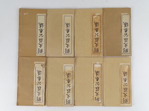 Ensemble de 8 volumes grand In-8° étroits en langue chinoise, brochés avec pièces de titre contre collées au 1ers plats (de menus défauts) - Environ 80 pages par volume - 2 volumes avec petites galeries de ver aux 1ers feuillets n’affectant...