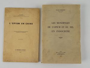 cartes hors texte - Ex-libris de Christian Fouanon gravé par Hélène Hué, représentant un fumeur d’opium allongé dans un décor de fleurs de pavot et de livres, surmonté de l’œil de l’ophtalmologiste, signé au crayon et numéroté 75/100 - Bon intérieur - SIMON (Paul) - L’opium en Chine - Tilff, liège ; M. Nierstrasz, 1939 - 1 plaquette In-8° agrafée (couverture salie) - 18 pages - Bon intérieur.