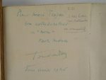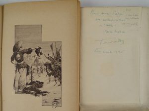 skyvertex bordeaux - Dos à nerfs - Pièce de titre skyvertex noir - Ex-libris de Christian Fouanon gravé par Hélène Hué, représentant un fumeur d’opium allongé dans un décor de fleurs de pavot et de livres, surmonté de l’œil de l’ophtalmologiste, signé au crayon et numéroté 23/100 - Le cinquième bonheur - Paris ; Louis-Michaud, sans date - 1 volume In-12° - Reliure cartonnage marbré (petite épidermure au 1er plat) - Dos lisse titré or (1 petite épidermure) - Envoi autographe signé - L’Annam sanglant - Paris ; Chamuel, 1898 - 1 volume In-8° broché (1er mors recollé) - Illustrations hors texte en noir de A. Cézard - Ex-libris de Christian Fouanon gravé par Hélène Hué, représentant un fumeur d’opium allongé dans un décor de fleurs de pavot et de livres, surmonté de l’œil de l’ophtalmologiste, signé au crayon et numéroté 25/100 - L’heure silencieuse (Les livres de la Brousse) - Paris ; Les Éditions du Monde Moderne, sans date - 1 volume In-12° non rogné (de petites déchirures à la 1ère couverture, la 2nde tachée) - Édition originale nominative, l’1 des 6 sur vergé de Hollande - Ex-libris de Christian Fouanon gravé par Hélène Hué, représentant un fumeur d’opium allongé dans un décor de fleurs de pavot et de livres, surmonté de l’œil de l’ophtalmologiste, signé au crayon et numéroté 28/100 - Exemplaire enrichi d’1 envoi autographe signé daté avril 1926.