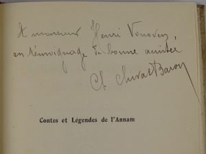 signée Normand, Paris, sous emboîtage de carton illustré couleurs (frotté et quelques fentes) - Couvertures et dos conservés - Dos lisse titré à l’identique - Tête dorée - Recueil de 31 contes et légendes, qui mettent en lumière les superstitions annamites - Très bon exemplaire en édition originale enrichi d’1 envoi autographe signé de l’auteur au faux titre.