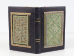pièces de tissu ancien brodé provenant d’1 travail artisanal d’Afghanistan - Contre plats encadrés d’1 filet de cuir turquoise et doublés de soie brique ainsi que les gardes - Dos à nerfs titré or - Couvertures vert d’eau conservées (légèrement salies), la 1ère illustrée - Ex-libris de Christian Fouanon gravé par Hélène Hué, représentant un fumeur d’opium allongé dans un décor de fleurs de pavot et de livres, surmonté de l’œil de l’ophtalmologiste, signé au crayon et numéroté 8/100 - Bon exemplaire en édition originale.