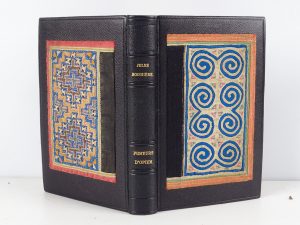 signée Sophie Charlot - Plats incrustés de 2 pièces de tissu ancien brodé provenant d’1 travail artisanal d’Afghanistan - Contre plats encadrés d’1 filet de cuir marine et doublés de soie brique ainsi que les gardes - Dos à nerfs titré or - Couvertures et dos conservés (la 1ère illustrée par Geo Dorival - Ex-libris de Christian Fouanon gravé par Hélène Hué, représentant un fumeur d’opium allongé dans un décor de fleurs de pavot et de livres, surmonté de l’œil de l’ophtalmologiste, signé au crayon et numéroté 9/100 - Bon exemplaire.