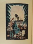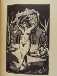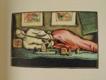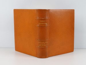 gravés sur bois - Belle reliure janséniste de l’époque maroquin à gros grain saumon signée A. R. Pourrieux - Contre plats encadrés de maroquin saumon avec moire saumon centrale, encadrée d’1 large filet de maroquin vert et ornés de filets dorés aux angles (4 très petites épidermures en bas du 2nd contre plat), 1ère et dernière gardes moirées à l’identique, gardes de papier saumoné mouchetées d’or - Couvertures et dos conservés - Coupes ornés de filets à froid - Dos à nerfs titré et daté or - Tête dorée - Ex-libris de Christian Fouanon gravé par Hélène Hué, représentant un fumeur d’opium allongé dans un décor de fleurs de pavot et de livres, surmonté de l’œil de l’ophtalmologiste, signé au crayon et numéroté 92/100 - Excellent exemplaire numéroté sur japon impérial (n°7 sur les 20, tirage total : 250) contenant 1 suite des bois en couleurs reliée avec le texte et 1 suite de décomposition des couleurs reliée in fine.