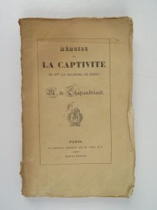 CHATEAUBRIAND (M. de) - Mémoire de la captivité de Mme la Comtesse de Berry - Paris ; Le Normant, 1833 - 1 volume In-8° broché (couverture partiellement insolée, manques au dos, des pages écornées) - Édition originale.