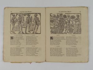 In-4° broché (1ère couverture détachée avec manque, dos et 2nd plat de couverture manquants, ouvrage en partie débroché) - [6], 66 pages mal paginées 67 - Papier jauni, des auréoles éparses, des manques angulaires - Réimpression de l'édition de 1486 ornée des 56 bois gravés pour la Danse macabre de Troyes, exécutés avec les bois anciens que l'éditeur avait acquis quelques années auparavant. Vendu en l’état.