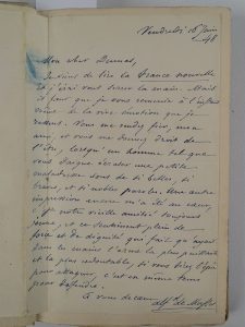 vélin quelque peu piqué) - Couvertures vertes conservées (salies avec manques angulaires et petites déchirures aux contours) - Dos lisse orné de filets et daté or (légèrement assombri) - Pièce de titre maroquin noir - Bon exemplaire en édition originale tirée à 500 exemplaires du 1er ouvrage de l’auteur publié sous son nom enrichi d’1 lettre autographe signée d’Alfred de Musset adressée à Alexandre Dumas dans laquelle il évoque la publication de Dumas dans son journal La France Nouvelle qui vole à son secours suite à sa révocation de ses fonction de bibliothécaire au Ministère de l’Intérieur : « Vendredi 16 juin [18]48 - Mon Cher Dumas, Je viens de lire la France Nouvelle et j’irai vous serrer la main. Mais il faut que je vous remercie à l’instant même de la vive émotion que je ressens. Vous me rendez fier, mon ami, et vous me donnez droit de l’être, lorsqu’un homme tel que vous daigne écraser une petite maladresse sous de si belles, si braves, et si nobles paroles. Une autre impression encore m’a été au cœur, c’est notre vieille amitié toujours jeune, et ce sentiment plein de force et de dignité qui fait qu’ayant dans les mains l’arme la plus puissante et la plus redoutable, si vous tirez l’épée pour attaquer, c’est en même temps pour défendre. À vous de cœur. Alft d de Musset » - Y est contre collée en regard : L’enveloppe adressée à Dumas au siège de La France Nouvelle de la main de Musset avec cachet de cire, ainsi qu’1 lettre en feuillet séparé (déchirure sans perte) du bibliothécaire en chef de la Bibliothèque Municipale de Nantes mentionnant le prêt de l’ouvrage dans le cadre de l’exposition Baudelaire, Musset, Flaubert en 1957 - Exemplaire unique.