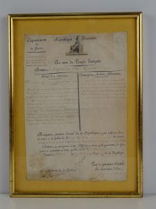 de l’an onze [10 juin 1803] - Signature de Bonaparte (Secrétaire), contresignée par le ministre de la Guerre, Alexandre Berthier, et par le secrétaire d’État, Hugues Maret - 1 page In-folio sur vélin en partie imprimée, vignette gravée par B. Roger, sceau sous papier - 33x23 cm - Encadré sous verre - Bon état.