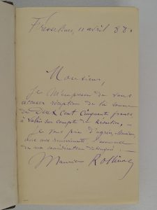 (1 coin frotté) - Dos lisse orné de filets dorés et titré or (uniformément passé) - Ex-libris de Christian Fouanon gravé par Hélène Hué, représentant un fumeur d’opium allongé dans un décor de fleurs de pavot et de livres, surmonté de l’œil de l’ophtalmologiste, signé au crayon et numéroté 19/100 - Bon exemplaire en édition originale du tirage courant, enrichie d’1 lettre autographe signée de Rollinat, très certainement à son éditeur, datée de [18]88 et reliée avant le portrait.
