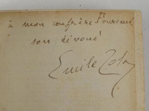 successeur de Yseux-Simier - Couvertures et dos jaunes conservés (salis avec petits 2 petits manques angulaires, dos restauré) - Dos à nerfs titré or - Tête dorée - Bon exemplaire en édition originale sur papier d’édition enrichi d’1 envoi autographe signé d’Émile Zola « à mon confrère Fourcaud son dévoué Emile Zola » à l’encre noire au faux titre (celui-ci restauré). Le confrère que Zola évoque est très probablement Louis de Fourcaud, historien d'art, poète, musicographe et musicien.