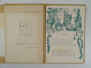 envoi autographe et dessin original à l’encre noire de Jean Bruneau à Christian Fouanon à la 1ère garde blanche, numéroté sur pur fil O. C. F. auquel on joint : 3 lettres de l’Association des amis de Robert Brasillach adressées à M. Fouanon, 1 lettre autographe signée de Jean Bruneau, 1 photo de Robert Brasillach enfant, 1 carte postale, 1 plaquette d’exposition Jean Bruneau à la galerie Decré, 5 reproductions légendées de Jean Bruneau sur feuilles In-8° et divers documents, ainsi qu’1 autre exemplaire du même ouvrage de Brasillach, celui-ci justifié non numéroté (gardes partiellement jaunies).