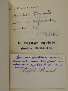 plats - Dos lisse titré or en long - Couvertures et dos conservés - Très bon exemplaire en édition originale, sur alfa d’Écosse numéroté H. C. 169 parmi les 300 réservés à la presse (tirage total des exemplaires hors commerce : 335) - L’ouvrage est enrichi d’1 envoi autographe signé de Colette à Aristide Briand à l’encre noire en page de faux titre, ainsi que truffé d’1 billet de la main d’Aristide Briand.