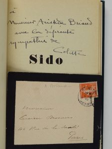 or en long (infimes griffures et léger accroc) - Couvertures et dos conservés - Très bon exemplaire en édition originale, sur simili japon de couleurs numéroté H. C. 306 parmi les 120 réservés à l’auteur et à la presse (tirage total des exemplaires hors commerce : 353) - L’ouvrage est enrichi d’un envoi autographe signé de Colette à Aristide Briand à l’encre noire en page de faux titre, ainsi que truffé d’un billet et d’une enveloppe de la main d’Aristide Briand, adressés à l’écrivain naturaliste et libertaire Lucien Descaves.