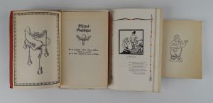 classiques - Paris ; L’Édition, 1921 - 1 volume In-8° étroit broché sous couverture rempliée (1 petite fente au 1er mors) - Texte encadré et illustrations en noir in texte de Touchet - Ex-libris gravé de Jacques et Antoinette Geraud, cachet ex-libris à sec de J.-C. Landry et ex-libris de Christian Fouanon gravé par Hélène Hué, représentant un fumeur d’opium allongé dans un décor de fleurs de pavot et de livres, surmonté de l’œil de l’ophtalmologiste, signé au crayon et numéroté 79/100 - Édition originale de cet amusant recueil licencieux tiré à petit nombre sur vélin d'Arches - Missel phallique. 69 et quelques autres refrains paillards choisis et recueillis par le Grand Conseil de l’ordre du Phallus - Rueil-Malmaison ; Imprimerie Socopresse, sans date - 1 volume grand In-12° broché - sous couverture illustrée au 1er plat - Des illustrations in et hors texte - Bréviaire du Carabin - Sans lieu ; Les Éditions du Folklore Estudiantin, sans date [vers 1960] - 1 volume In-12° agrafé - Illustrations in et hors texte en noir.