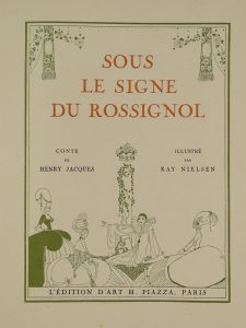 JACQUES (Henry) - Sous le signe du rossignol - Paris ; L’Édition d’Art H. Piazza, [1923] - 1 volume In-4° broché sous couverture rempliée encadrée or et noir et illustrée au 1er plat, vignette en vert au 2nd - 15 compositions en noir ou en...