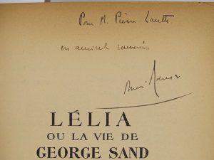 à nerfs titré or - Tête havane - Bon exemplaire enrichi d’1 envoi autographe signé de André Maurois au faux titre et d’1 envoi autographe signé et daté 1952 de Aurore Sand, petite fille de George Sand, à la page de dédicace, le tout adressé à Paul Lauth.