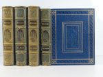 Reliure éditeur chagrin bleu - Médaillon central frappé à froid figurant le portrait de Montaigne aux 1er plats, dans quadruple encadrement doré et encadrement de frise frappée à froid et ornée or, sous emboîtages bordés - Dos à nerfs (passé et frottés), ornés à froid, titrés et tomés or - Gardes moirées bleues - Têtes dorées - Bon exemplaire numéroté sur vélin de Rives.