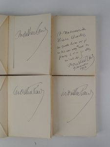 titrée au dos (1 petite fente au 2nd mors) et emboîtage à l’identique (partiellement fendu et légèrement frotté) - Bon exemplaires numérotés sur vélin - Exemplaires enrichis d’1 envoi autographe signé de Henry de Montherlant à la 1ère garde du 1er volume et de sa signature autographe aux 1ères gardes des autres volumes - Il y a encore des paradis. Images d’Alger (1928-1931) - Alger ; P. & G. Soubiron, [1935] - 1 volume petit In-8° - 52 héliogravures in et hors texte - Reliure de l’époque demi-cartonnage gris - 1ère couverture couleurs de Léon Carré conservée (légèrement épidermée aux contours) - Dos à nerfs - Pièces de titre orangées - Bon exemplaire - Bon ensemble.