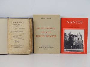 pages - Angles inférieurs des 1ers feuillets fragilisés, quelques rousseurs éparses – Reliure contemporaine box noir non signée de Sophie Charlot (petites taches au 1er plat) - Dos lisse titré or - Tête dorée - JARNOUX (Chanoine A.) - Au pays Nantais. Ceux-ci furent traqués. Prêtres fusillés, massacrés ou guillotinés 1793-1797 - Sans lieu ; Sans nom, 1974 - 1 volume In-8° broché - Faux titre froissé - Des illustrations hors texte - DURAND (Yves) - Le diocèse de Nantes - Paris ; Beuchesne, 1985 - 1 volume In-8° broché - Couverture illustrée au 1er plat - Bon exemplaire.