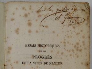 GUÉPIN (Ange) - Essais historiques sur les progrès de la ville de Nantes - Nantes ; Prosper Sebire, 1832 - 1 volume In-12° broché (couverture frottée avec petits manques) - Des rousseurs éparses, prononcées en début de volume - Envoi...