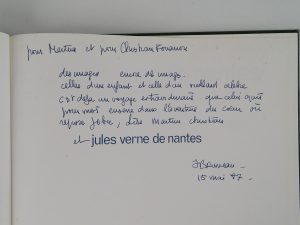 Bibliothèque Municipale de Nantes, 1982 - 1 volume In-4° broché - Des reproductions photographiques et documents en noir hors texte - Bon exemplaire numéroté 163 sur 250. BOUYER (Henri) - BRUNEAU (Jean) - Jules Verne de Nantes - Sans lieu ; Ateliers du Bois des Dons, Pierre Gauthier, imprimeur éditeur, [1978] - 1 volume In-4° oblong - 15 aquarelles originales hors texte de Jean Bruneau - Reliure éditeur plein skyvertex vert titré or et illustré d’1 aquarelle contre collée au 1er plat - Très bon exemplaire en édition originale numérotée (1131 sur 300), signée par l’auteur et l’artiste et enrichie d’1 envoi autographe signé de Jean Bruneau à Martine et Christian Fouanon.