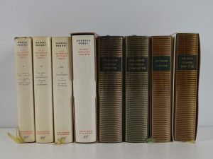 MONTHERLANT - Théâtre - MALRAUX - Œuvres complètes (tome I) - Paris ; Gallimard, NRF, Bibliothèque de la Pléiade, 1960 à 1989 - Reliures éditeur chagrin vert sapin, havane ou brun sous rhodoïds, jaquettes ou emboîtages carton gris ou illustrés - Dos lisses ornés, titrés et tomés or - Têtes orangées, grises ou bleues - (manque au rhodoïd du tome I des Proust) - Bon état.