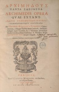 ARCHIMÈDE. — Archimedous Panta sozomena [en grec]. — Archimedis Opera quae extant, novis demonstrationibus, commentariisque illustrata per Davidem Rivaltum a Flurantia ... — Parisiis, apud C. Morellum, 1615. — In-folio, [22] f., 549 p.,...