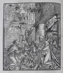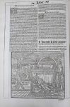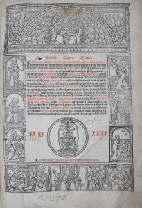 Vulgate suivant l'édition de Lyon, Jean Crespin, 1529. Elle est illustrée de figures gravées sur bois, dont une à mi-page et une à pleine page. Titre dans un cadre ornemental gravé sur bois, imprimé en rouge et noir, comme le sont les Canons d'Eusèbe Pamphile.