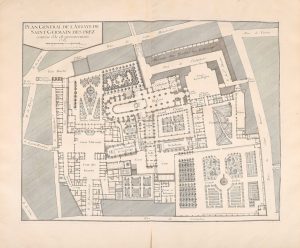BOUILLART (Jacques). — Histoire de l'Abbaye Royale de saint Germain des Prez. — Contenant la vie des abbez qui l'ont gouvernée ... Avec la description de l'église, des tombeaux... — À Paris, chez J. Dupuis, 1724. — Deux parties en 1 vol....