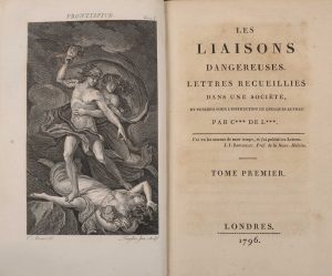 [CHODERLOS DE LACLOS (P.-A.-F.)]. — Les liaisons dangereuses. — Lettres recueillies dans une société, et publiées pour l'instruction de quelques autres. — Par C*** de L***. Londres, s.n., 1796 [i.e. vers 1812]. — 2 volumes in-8, 415 p. +...