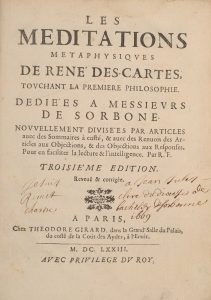 DESCARTES (René). — Les méditations métaphysiques ... touchant la première philosophie. — À Paris, chez Théodore Girard, 1673. — In-4, [20] f., 754 p., veau brun époque, dos à 5 nerfs, titre doré, caissons ornés, tranches mouchetées...