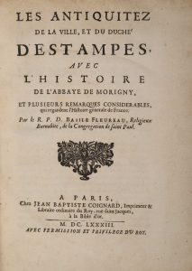 FLEUREAU (Basile). — Les Antiquitez de la ville et du duché d'Estampes, avec l'histoire de l'abbaye de Morigny, et plusieurs remarques considérables... — À Paris, chez J. B. Coignard, 1683. — In-4, [7] f., 618 p., [4] f., basane brune...