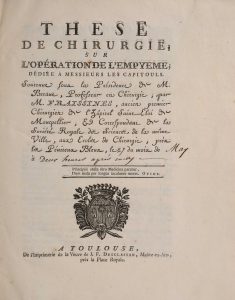 FRAISSINES. — Thèse de chirurgie sur l'opération de l'empyeme, dédiée à messieurs les capitouls. — À Toulouse, de l'Impr. de la Vve J. F. Desclassan, [1780]. — In-4, [2] f., 46 p., [1] f. d'errata, basane havane marbrée époque, eau...