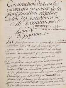 [MANUSCRIT]. — [FORTIFICATIONS]. — BOUDRET (Jean François). — Construction de tous les ouvrages en usage de la fortification régulière selon les sistemmes de Mr de Vauban. — Par M. Boudret à Biche encore alemande [1739-1741]. — In-4...