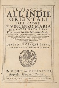 Seconde édition de cette relation d'Antonio Murchio de Bormio (1626-1679), en religion Père carmélite Vincenzo Maria de Sainte-Catherine de Sienne, qui fut envoyé en Inde en 1656 par la Sainte Congrégation de la Propagande de la Foi pour inspecter les missions catholiques de Goa, Kerala et Malabar. Il revint à Rome en 1658.