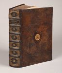 • L'histoire ecclésiastique nommée tripartite, divisée en douze livres ... — À Paris, pour M. Locqueneulx, 1578. — 2 ouvrages en 1 fort vol. in-folio, [10]-445-[25] f. ; [10] f., 226 p., [4] f., nombreux bandeaux et lettrines gravés sur bois, veau brun du XVIIe s., dos à 6 nerfs, titre doré, caissons ornés de fers angulaires de d'un monogramme répété, armes frappées au centre de chaque plat, restaurations soignées (taches claires aux ff. 18-19 et 270, piqûre de ver en marge depuis le titre jusqu'à f.250, mouillure claire sporadique marginale, puis étendue du f. 350 au début de la 2e partie).