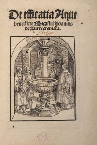 ♦ Rare opuscule traitant du baptême et de l'eau bénite, composé par Juan de Torquemada (1388-1468), théologien dominicain espagnol, nommé cardinal en 1439, puis successivement évêque de Cadix (1440), d'Orense (1442-1445), de Leon (1460), à nouveau d'Orense (1463), et enfin de Sabina e Poggio Mirteto, Italie (1463). Il était l'oncle du célèbre inquisiteur Tomás de Torquemada.