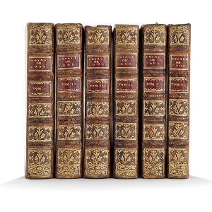 COOK (JAMES). VOYAGE AU PÔLE AUSTRAL ET AUTOUR DU MONDE. Paris, 1778. 6 vol. in-8 et un atlas in-4, veau tacheté, dos à nerfs ornés, pièces de titre et de tomaison en maroquin rouge (Rel. de l’époque).