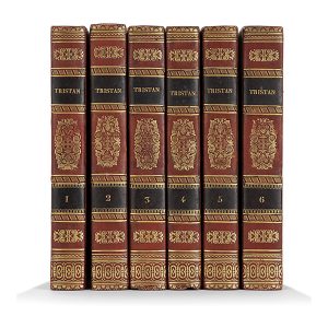 MARCHANGY. — TRISTANT LE VOYAGEUR OU LA FRANCE AU XIVE SIÈCLE. — Paris, Maurice et Urbain Canel, 1825-1826. — 6 vol. in-8, demi-veau rose avec petits coins, dos lisse orné, pièces de titre et de tomaison noires, tranches marbrées (Rel. de...