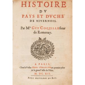 [NIVERNAIS]. - COQUILLE (GUY). — HISTOIRE DU PAYS ET DUCHÉ DE NIVERNOIS. — Paris, Veuve d’Abel l’Angelier, 1612. — In-4, vélin, traces de lacets (Rel. de l’époque).
