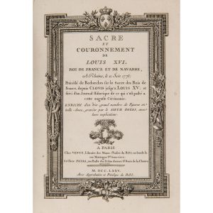 Édition originale de ce beau livre de fête comprenant les « Recherches sur le Sacre des Rois de France depuis Clovis jusqu’à Louis XV » par N. Gobet, suivi du « Sacre de Louis XVI » puis « Le Journal historique de ce qui s’est passé à cette auguste cérémonie », par l’Abbé Pichon.