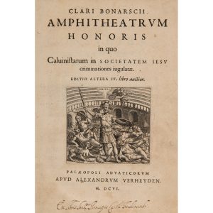 SCRIBANI (CHARLES, SOUS L’ANNAGRAMME CLARI BONARCII). — AMPHITHEATRUM HONORIS IN QUO CALVINISTARUM IN SOCIETATEM JESU CRIMINATIONES IUGULATAE. — Anvers, apud Alexandrum Verheyden (Plantin Moretus), 1606. — In-4, demi-vélin à coins, dos...