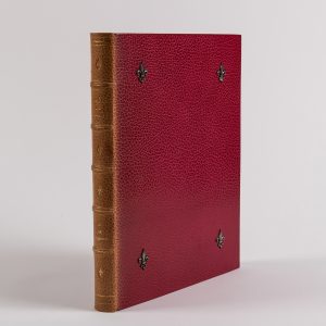 [f] MARIE DE FRANCE. — LAI DE GUIGAMER. — Nice, Joseph Pardo, 1960. — In-4, maroquin rouge, couvertures de papier fleurs, aux angles des plats fleurs de lys de laiton, étui avec compartiment pour le cuivre dans l’épaisseur (Emboîtage de...