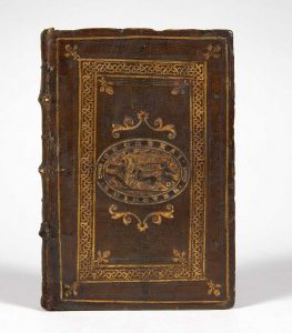 Spécimen de fausse reliure au médaillon horizontal d'Apollon et Pégase, sans doute exécutée au XIXe siècle par Vittorio Villa, l'un des deux grands faussaires spécialisés dans ce type de reliure. Si la reliure est authentique et de l’époque, la plaquette centrale et probablement les gros fers l'entourant sont des ajouts postérieurs.