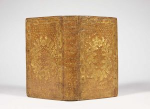 veau beige rosé, filet doré, plats entièrement couverts d'un semé de petites fleurs de lis avec couronne de laurier répétée formant bordure, au centre grand médaillon de branchages dorés autour duquel est frappée une devise, nom du possesseur en capitales dorées en tête et pied, traces d'attaches, dos lisse orné d'un même semé et d'un rébus en capitales dorées disposé sur onze lignes, tranches dorées (reliure de l'époque).