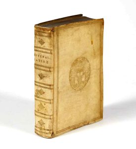 JUVÉNAL et PERSE. — Satyrae. — Leyde, F. Hackius, 1648. — In-8, 8 ff. (y compris le titre-frontispice), 641 pp. et 23 ff.n.ch. (le dernier blanc) : vélin, double filet doré, armoiries au centre, dos lisse orné, tranches dorées (reliure de...