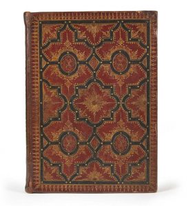 compartiments de forme ovale ou losangée agencés autour d'un cartouche central de forme quadrilobée, le tout agrémenté de nombreux petits fers et fleurons dorés dont petites étoiles disposées en semé et besants, dos lisse orné de même en long, tranches dorées et ciselées sur marbrure, cinq onglets de tissu rose (reliure de l'époque).