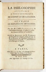 TERRASSON (L'Abbé Jean). — La Philosophie applicable à tous les objets de l'esprit et de la raison. — Ouvrage en réflexions détachées. — Paris, Prault & Fils, 1754. — In-12, LXX pp., 1 f.n.ch., 239 pp. et 1 p.n.ch. (Approbation) :...