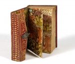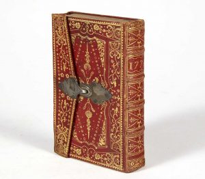aux petits fers, fermoir à agrafe métallique, dos orné, doublure et garde de papier doré peint au pochoir, tranches dorées (reliure anglaise de l'époque).