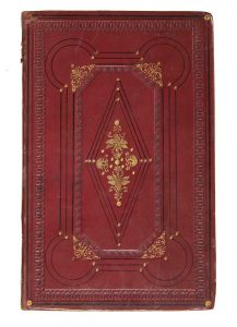 rectangle-losange aux angles arrondis en saillie, petit fer doré aux angles, fleuron doré au centre, dos lisse orné, tranches dorées (reliure de l'époque).