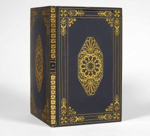 dorés, plaque de forme octogonale au centre, dos lisse orné en long, roulette intérieure, doublure et gardes de papier moiré lilas, tranches dorées (Gaudard).